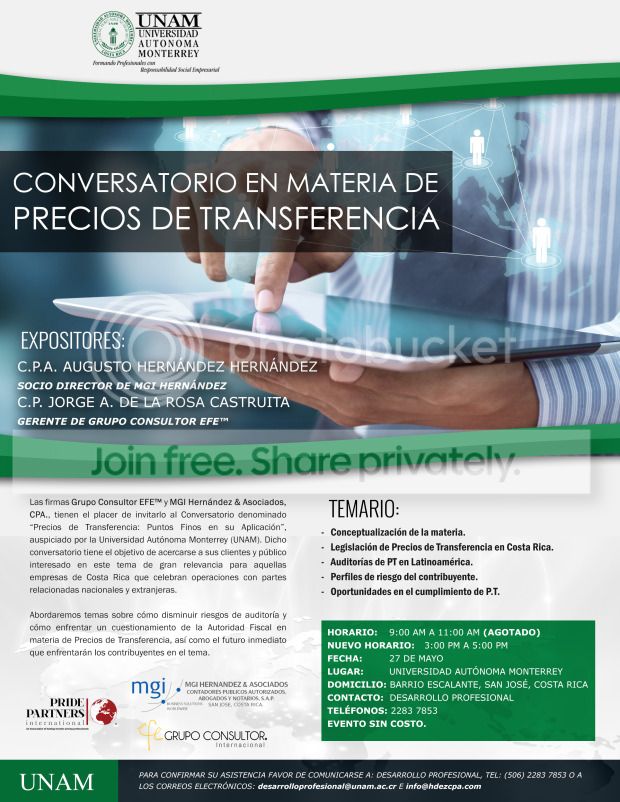 El día 27 de mayo del presente, en la ciudad de San José, Costa Rica, y en alianza con laUniversidad Autónoma de Monterrey y la firma internacional MGI Costa Rica, celebramos el Taller Precios de Transferencia: Puntos finos en su aplicación, mismo que fue impartido por el Director Centroamericano de Grupo Consultor EFE, el C.P.I. Jorge De la Rosa.